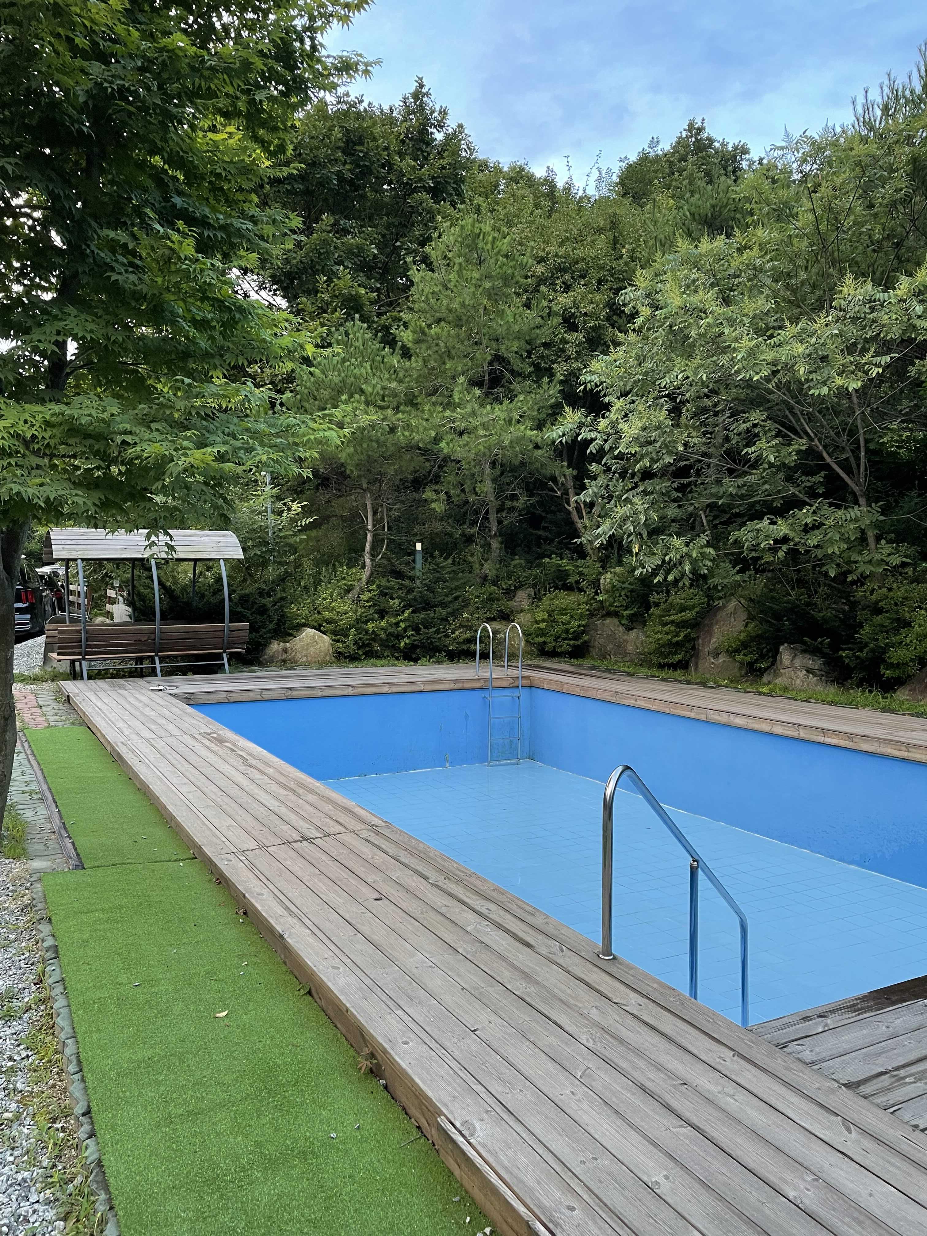 그 뒤에는 수영장이 있는데, 코로나 때문에 물을 안 받아 놓은 것 같아요.
